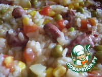 когда в сердечках испарится влага и они слегка поджарятся, добавляем в сковороду рис |