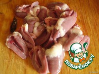 куриные сердечки промываем, удаляем пленку и обрезаем ненужные части, разрезаем пополам и еще раз хорошо промываем, отставляем пока |