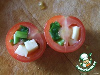 Теперь начиняем наш помидор сыром и луком. Я в выемки положила так, чтобы при соединении помидора сыр и лук были в обеих половинках. |
