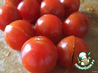 Берем помидоры черри (можно, конечно, и обычные помидоры, но тогда, я думаю, их будет лучше очистить от кожицы), разрезаем пополам и вынимаем семена. |