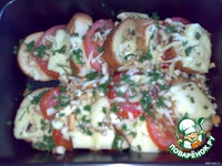Форму смазываем маслом и выкладываем багет, сыр и помидоры, как черепицу. Сбрызгиваем маслом, посыпаем перцем, тертым сыром (слегка) и отправляем в разогретую до 180гр духовку на 10 мин. |