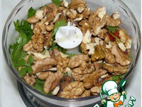 И орехи. А также соль, перец, уксус и оливковое масло. При помощи блендера взбить все ингредиенты. |