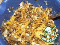 Сварить яйца, остудить. Нарезать их мелкими кусочкам. Далее взять сыр и натереть его на крупной тёрке. Добавить яйца и сыр к моркови, луку и шампиньонам. |