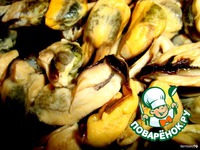 Вино довести до кипения, добавить чеснок, перец и лавровый лист. Выложить мидии и варить 3-4 минуты. |