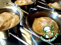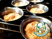 Формочки смазать сливочным маслом, выложить суфле. Формы с суфле поставить в противень. Залить в противень горячей воды до половины формочек. Поставить в разогретую до 180 градусов духовку. |