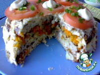 Затем сверху кладем мясной блинчик, а поверх него выкладываем морковь с луком. Сверху кладем снова овощной блинчик. Снова смазываем его сырно-майонезной смесью |