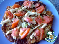 Затем кладем еще один овощной блинчик. Сверху снова смазываем сырно-майонезной смесью и режем сверху помидоры дольками |