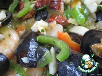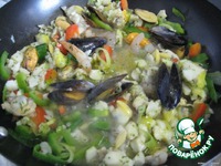 Туда же выкладываем и морской коктейль (можно в замороженом виде, тогда при тушении он даст жидкость, необходимую для соуса), |