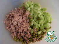 Огурец очистить от кожицы, нарезать четвертинками. Тунец - размять вилкой. Всё смешать, добавить зелёный горошек. |