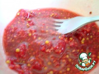 Кладем туда же половину ягод малины, разминаем их вилкой и все аккуратно смешиваем. Заправка готова. |