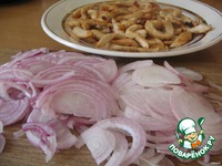 Кусочки мяса выкладываем на плоское блюдо и сбрызгиваем апельсиновым соком. Лук нарезаем тонкими полукольцами и обжариваем на оставшемся оливковом масле в той же сковороде, где жарилось филе. |