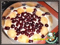 Выливаем тесто в форму, раскладываем фрукты (вишня, абрикос в моем случае)слегка вдавливая в тесто. |