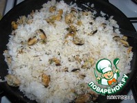 Когда лук подрумянился, всыпаем в сковороду мидии. |