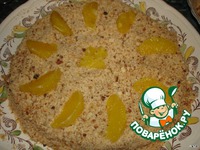 Украсить крошкой, сделанной из остатков от коржей, и дольками от апельсина. |