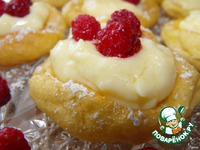 Готовые колечки наполнить кремом, на крем выложить по три ягодки малины и посыпать сахарной пудрой. Приятного чаепития!!! |