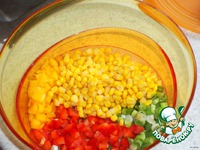 Зеленый лук, паприку мелко режем, кукурузу с мелко порезанными овощами кладем в салатницу. |