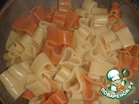 К этому времени макароны уже должны свариться, при варке добавить 1 столовую ложку оливкового масла. Макароны сцедить. У меня двухцветные сердечки. |