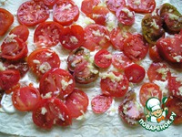 Накрываем вторым листом. Немного сметанки и много помидорных кружочков и давленного чесночка |
