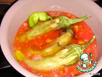 Нарезать помидоры + 1 стакан воды + растительное масло + баклажаны. Я еще добавила один маленький острый перчик. Поставить на огонь и варить до готовности. |