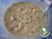 В тесто добавляем взбитые яйца, тунец, фету, зелень, томаты и перемешиваем. |