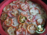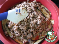 В форму выкладываем слоями : слой баклажан и пропитать его кетчупом на кетчуп выложить фарш и разровнять |