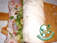 Выкладываем рулет на противень с двойным слоем фольги, хорошо смазываем сметано-горчичной смесью |