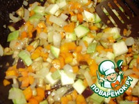 На разогретом растительном масле обжариваем лук и морковь, нарезанные кубиками |