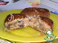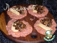 Грибы мелко порезать и обжарить с луком. Каждый мясной шарик придавить, сделав лепешку, положить сверху ложечку грибов и кусочек сыра. свернуть котлеткой, обвалять в сухарях и обжарить до готовности |