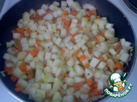 Порезать все овощи кубиками, кабачки почистить от кожицы, убрать семечки и тоже порезать кубиками 1х1 см. Жарим в небольшом количестве масла лук, затем добавляем морковь |