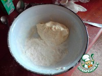 Творог, яйца, сода (гашенная кефиром), сахар, соль - все хорошо перемешать, добавляя муку, чтобы получилось упругое тесто. |