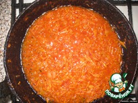Добавляем морковь, немного обжариваем и вливаем томат. Перемешиваем и тушим на небольшом огне 3-5 минут, пока выкипит лишняя жидкость. У меня томат был кисловат, поэтому я добавила немного сахара |