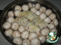 Моем шампиньоны и выкладываем их вокруг куриных рулетиков. |