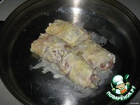 После того как курица промариновалась, из отбитых кусочков скручиваем рулетики. Их можно ничем не скреплять - они не развалятся. Выкладываем в форму или сковородку. |