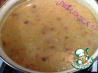Горох заливаю литром холодной воды и варю до готовности на небольшом огне. В процессе варки, по мере выкипания жидкости, доливаю в два приема еще литр воды. |