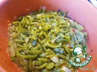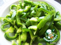 Чистим лук, мелко режем и поджариваем на растительном масле. Чистим и режем на полоски перец. |