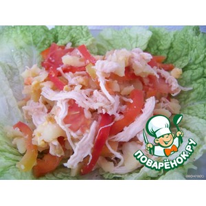 Куриное мясо разбираем на волокна. Картофель режем некрупно. Сыр трем на терке среднего размера |
