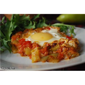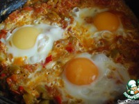 Описание: Шакшука - еврейская яичница на тушеных овощах. Это острый вариант с перцем чили - муж в восторге, теперь придется почаще ее делать. В оригинальном рецепте нет спагетти (как выдал поиск).