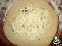 Раскатать тонкий большой круг, в середину уложить начинку. |