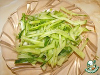 Огурец нарезать тонкой длинной соломкой или натереть на терке для корейской моркови. |