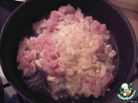 Добавляем вино и грибы, тушим, появляется много бульона, сливаем почти весь в отдельную посудину. |