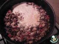 Из сметаны, майонеза (берите в той пропорции, какая вам больше нравится), бульона и специй делаем соус и выливаем его на сковородку. |