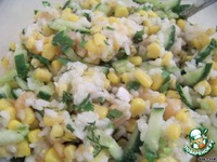 Добавляем рис. Количество – 1 стакан – указано для уже отваренного риса. Выкладываем кукурузу из банки, перемешиваем. |