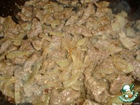 Приготовить соус: На сковороде растопить сливочное масло, добавить молока и муку. Все перемешать. Соус смешать с готовым мясом и протушить 2-3 мин. |
