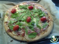 И в завершении, на готовую пиццу положить салат-рокет, ветчину и пластинки пармезана. Украсить помидорками. Приятного Всем аппетита! |