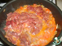 Затем выкладываем печень и тушим пока не перестанет вытекать кровь. |