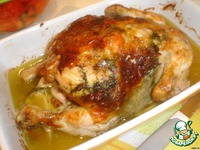 Курицу положить в рукав для запекания,положить в форму и запечь в разогретой духовке до 180гр,примерно 40мин. |