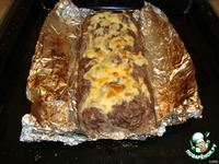 Затем достаем рулет из духовки, разрезаем ножницами сверху фольгу и посыпаем тертым сыром, включаем гриль и отправляем еще минут на 10, до образования румяной корочки. |