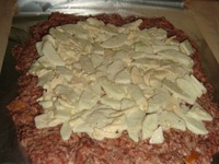 Пищевую фольгу смазать растительным маслом и на нее выкладываем мясной фарш. Сверху на фарш кладем яблочную начинку. |