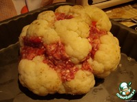 Сваренную капусту нафаршировать, как можно плотнее укладывая фарш между соцветиями |