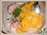 Снять с огня и дать остыть. Посолить, поперчить по вкусу фарш, добавить обжаренные овощи, зелень |
